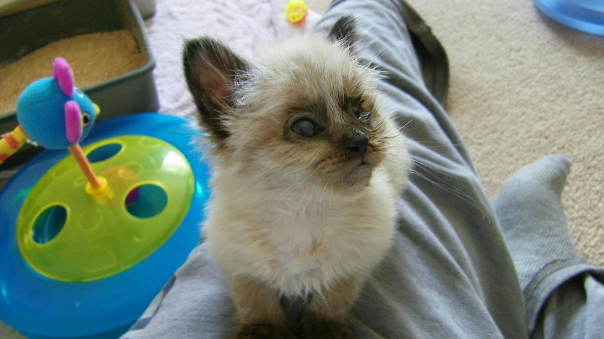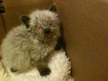 This wee Himalayan cross baby came into care with Holly's Hope Cat RescueHe was very tiny & very weak & we didn’t think he would survive but has proven courageous and determined in his will to live.  Hogan is a sweet 4-5 wk old little boy who deserves a chance. He was unable to nurse properly due to nasal congestion, so his growth was stunted. He’s only the size of a 2 week old baby. Our Vet said he should catch up now that he is getting regular feeding and medical care. He is also suffering from a severe eye infection which has cost him his sight and may result in him having one or both eyes removed.