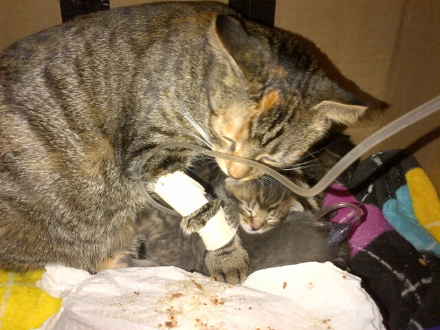 Calli was found abandoned in an empty apartment and after picking her up taking her to the vet it was found she was pregnant. Since then she has had four healthy kittens who she loves dearly. They are now two weeks old. Sadly on August 2, 2012 around 3pm we found Calli laying almost lifeless on the floor and in pain. She had also vomited so we rushed her to the vet but she had such a high fever and was so far gone ,we had to rush her to vet emerg. The first night away from her kittens Calli was in distress she missed them so we brought them to be with her. Through x-rays and scans a morphine drip and a four inch insicion from surgery to find out what was causing her pain she never left their side. The vet emergency staff were amazed they could not believe her dedication to her kittens. The vet said she would close to death at a 36 degree fever and that she is already a miracle. I think she's alive because she loved her babies so much. We have had lots of mom's and babies at Holly's Hope but we have never had a mom as dedicated as her. We will go to any length to save her so she is there for her kittens.