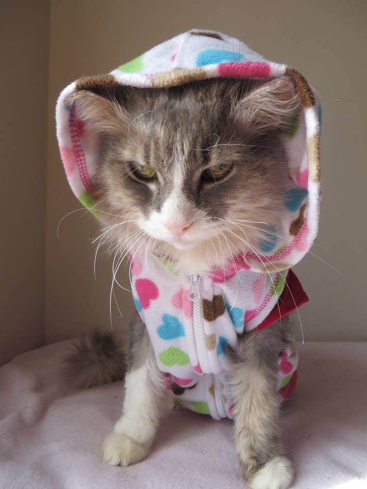 Meet Merry, a kitty you can't help but fall in love with. She was found outside alone, cold, abandoned and nearly dead from anemia. Merry was only about 5lbs when found and was covered in fleas. She is a long haired cat who needed to be shaved. The saddest thing about Merry's story were her paws. When she was found they were covered in open sores she could barely walk. To this day several months after her resuce she still struggles to get around. Merry was someones pet who ended up abandoned and alone. She loves people and loves even more to be wrapped in a sweater. Not many cats love to wear clothing but not Merry she feels warm and safe and just purrs purrs when she is weaing a shirt. Merry is an older kitty but has such an amzing personality, she is very sweet and gentle and loves attention. Her most beautiful feature is her eyes. Holly's Hope will make sure Merry will live a happy healthy life and ideally will be adopted into a loving forever home of her own. If you would like to help us support Merry and her care you can click here. we will keep you updated on Merry here and on our facebook page.
